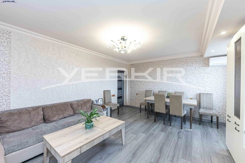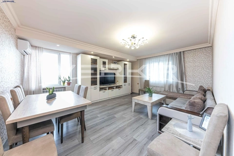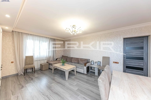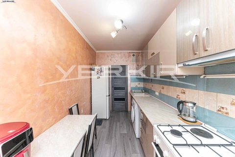 A 3-room apartment is for sale on the 4th floor of a 9-story building. The apartment is renovated: the windows have been replaced, the floor is covered with laminate, and a heating system has been installed. All necessary infrastructure is located nearby. The apartment is being sold together with the kitchen furniture.